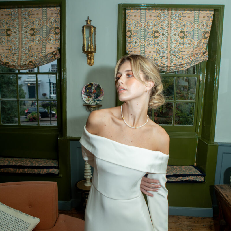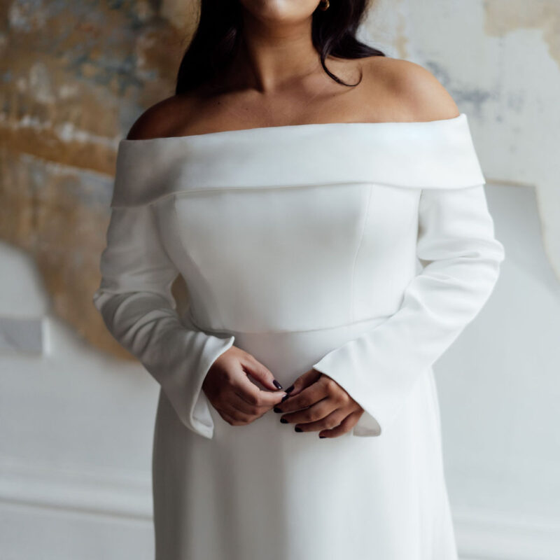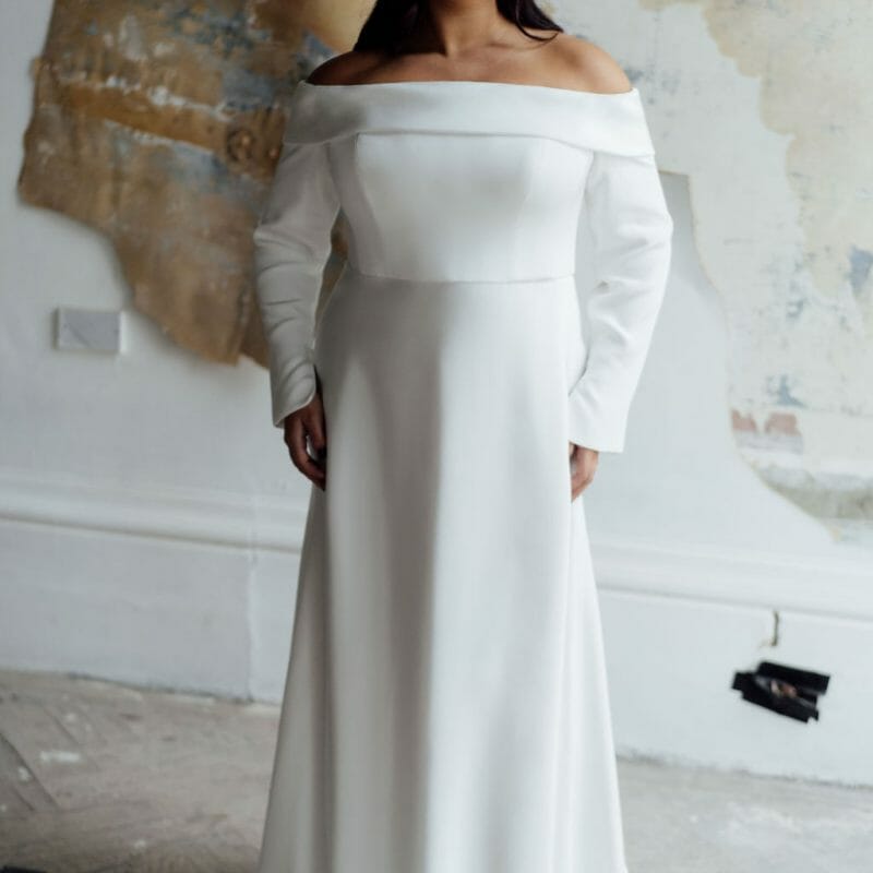 A Bardot off the shoulder dress with a soft silk column skirt. The bodice is lightly boned so it gives you lots of support, and it comes with detachable long sleeves so you have the option to wear the sleeves and then remove them later.
